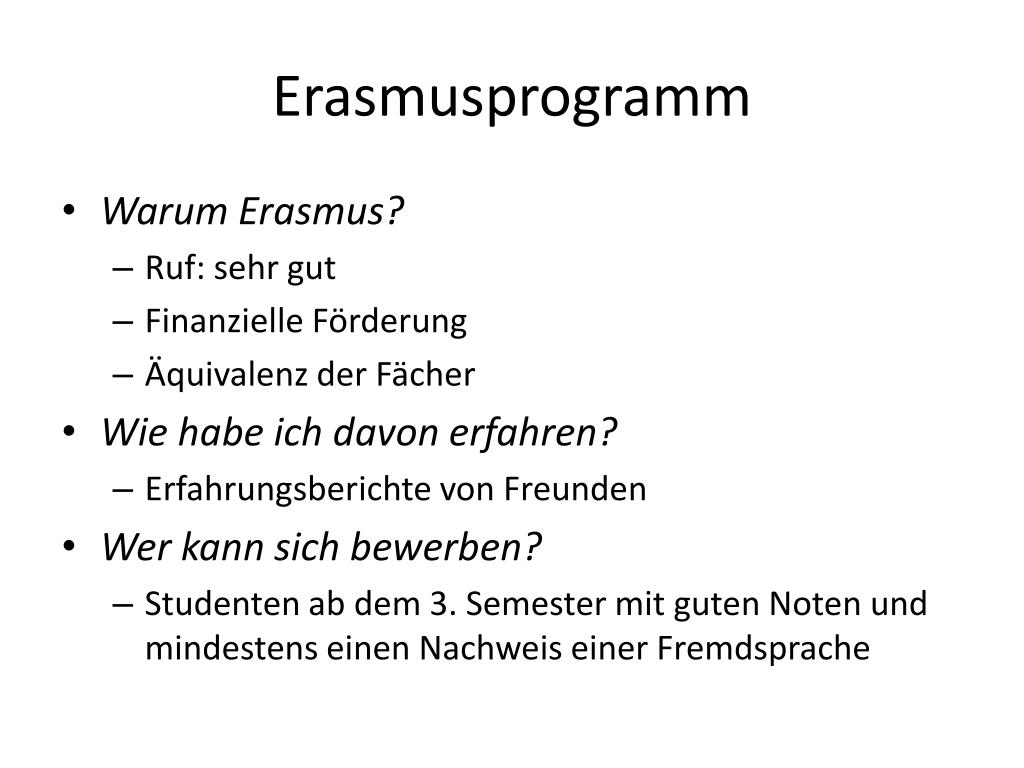 Erasmusprogramm • Warum Erasmus? • Ruf: sehr gut • Finanzielle Förderung • Äquivalenz der Fächer • Wie habe ich davon erfahren? • Erfahrungsberichte von Freunden • Wer kann sich bewerben? • Studenten ab dem 3. Semester mit guten Noten und mindestens einen Nachweis einer Fremdsprache