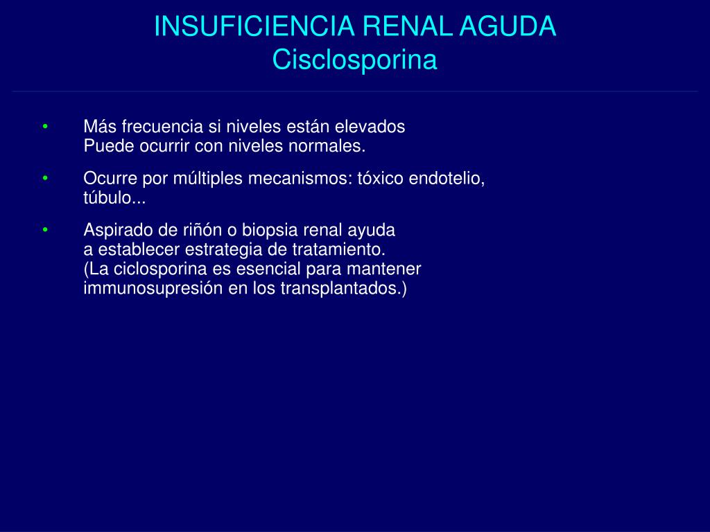 INSUFICIENCIA RENAL AGUDACisclosporina • Más frecuencia si niveles están elevadosPuede ocurrir con niveles normales. • Ocurre por múltiples mecanismos: tóxico endotelio,túbulo... • Aspirado de riñón o biopsia renal ayudaa establecer estrategia de tratamiento.(La ciclosporina es esencial para mantenerimmunosupresión en los transplantados.)
