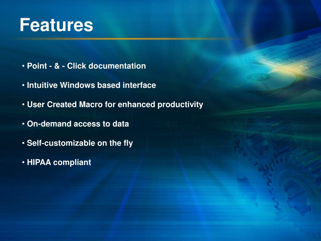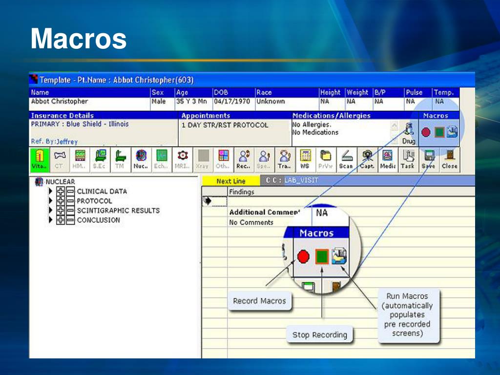 Features • Point - & - Click documentation • Intuitive Windows based interface • User Created Macro for enhanced productivity • On-demand access to data • Self-customizable on the fly • HIPAA compliant