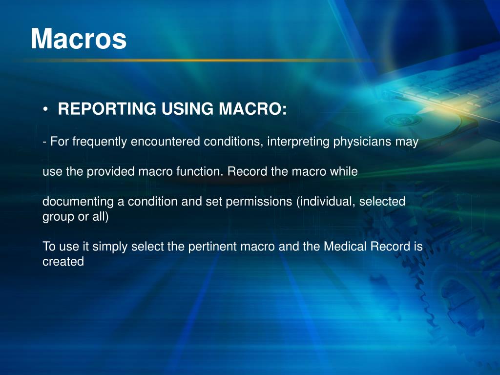 Macros • REPORTING USING MACRO: • - For frequently encountered conditions, interpreting physicians may • use the provided macro function. Record the macro while • documenting a condition and set permissions (individual, selected • group or all) • To use it simply select the pertinent macro and the Medical Record is created