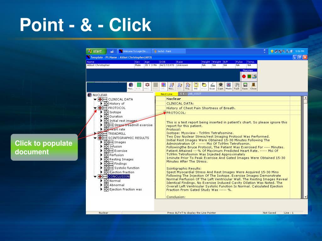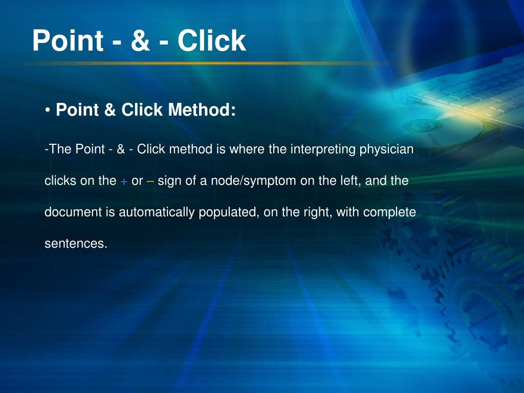 Point - & - Click • Point & Click Method: • The Point - & - Click method is where the interpreting physician • clicks on the + or – sign of a node/symptom on the left, and the • document is automatically populated, on the right, with complete sentences.