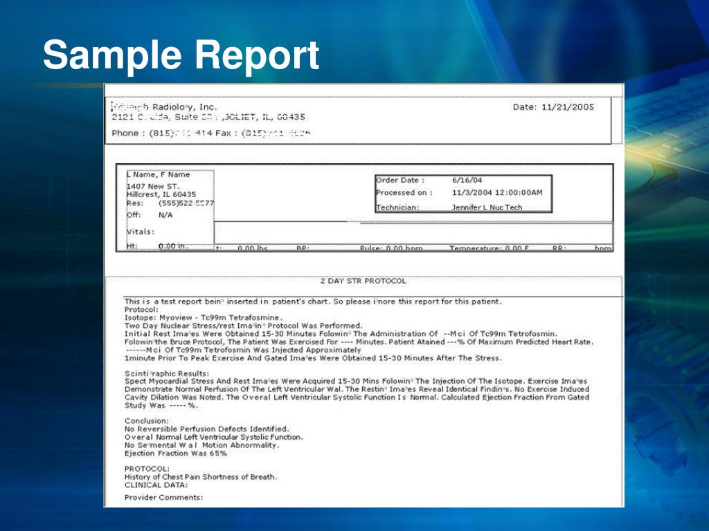 Additional (Optional) Modules • Scheduling for patients, tests, providers and technicians • Documentation for: • 24 Hrs Holter monitor • Stress Echo Cardiogram • Treadmill • PET • Ultrasound • Point of care billing • Exhaustive management reports