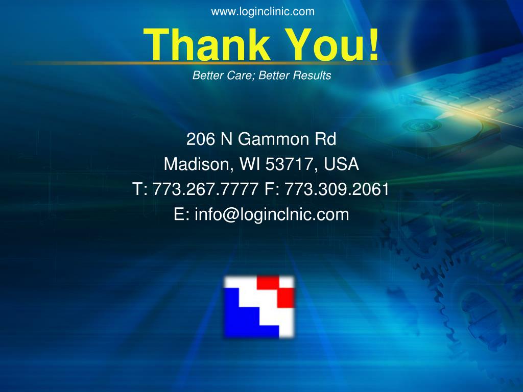 Better Care; Better Results 206 N Gammon Rd Madison, WI 53717, USA T: 773.267.7777 F: 773.309.2061 E: info@loginclnic.com www.loginclinic.comThank You!