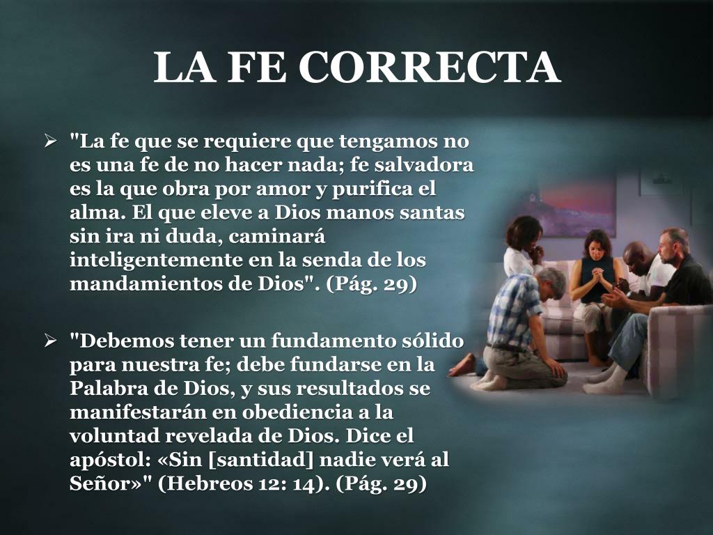 LA FE CORRECTA • "La fe que se requiere que tengamos no es una fe de no hacer nada; fe salvadora es la que obra por amor y purifica el alma. El que eleve a Dios manos santas sin ira ni duda, caminará inteligentemente en la senda de los mandamientos de Dios". (Pág. 29) • "Debemos tener un fundamento sólido para nuestra fe; debe fundarse en la Palabra de Dios, y sus resultados se manifestarán en obediencia a la voluntad revelada de Dios. Dice el apóstol: «Sin [santidad] nadie verá al Señor»" (Hebreos 12: 14). (Pág. 29)
