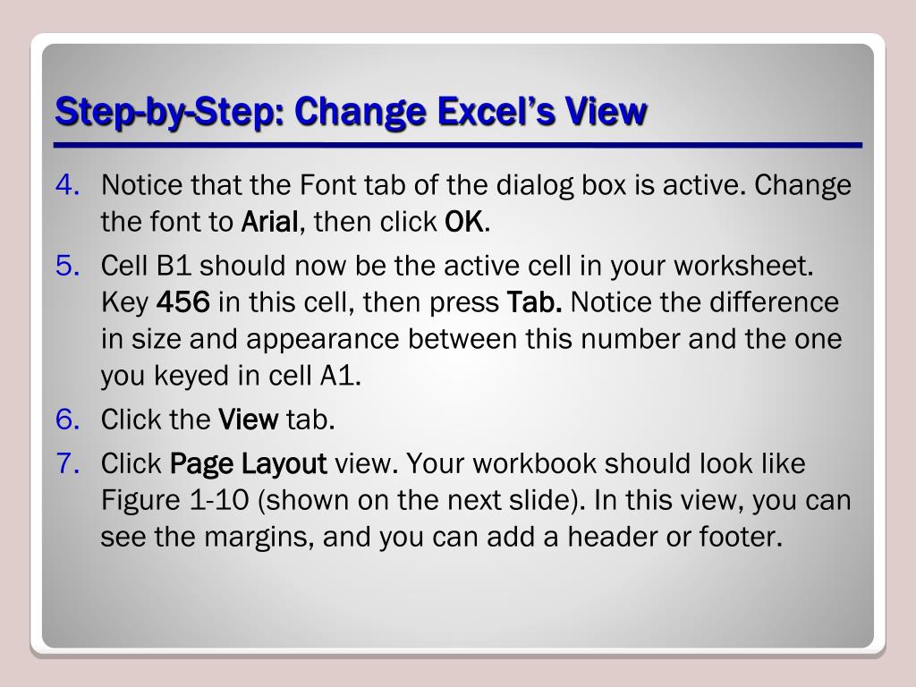 Step-by-Step: Change Excel’s View • Notice that the Font tab of the dialog box is active. Change the font to Arial, then click OK. • Cell B1 should now be the active cell in your worksheet. Key 456 in this cell, then press Tab. Notice the difference in size and appearance between this number and the one you keyed in cell A1. • Click the View tab. • Click Page Layout view. Your workbook should look like Figure 1-10 (shown on the next slide). In this view, you can see the margins, and you can add a header or footer.