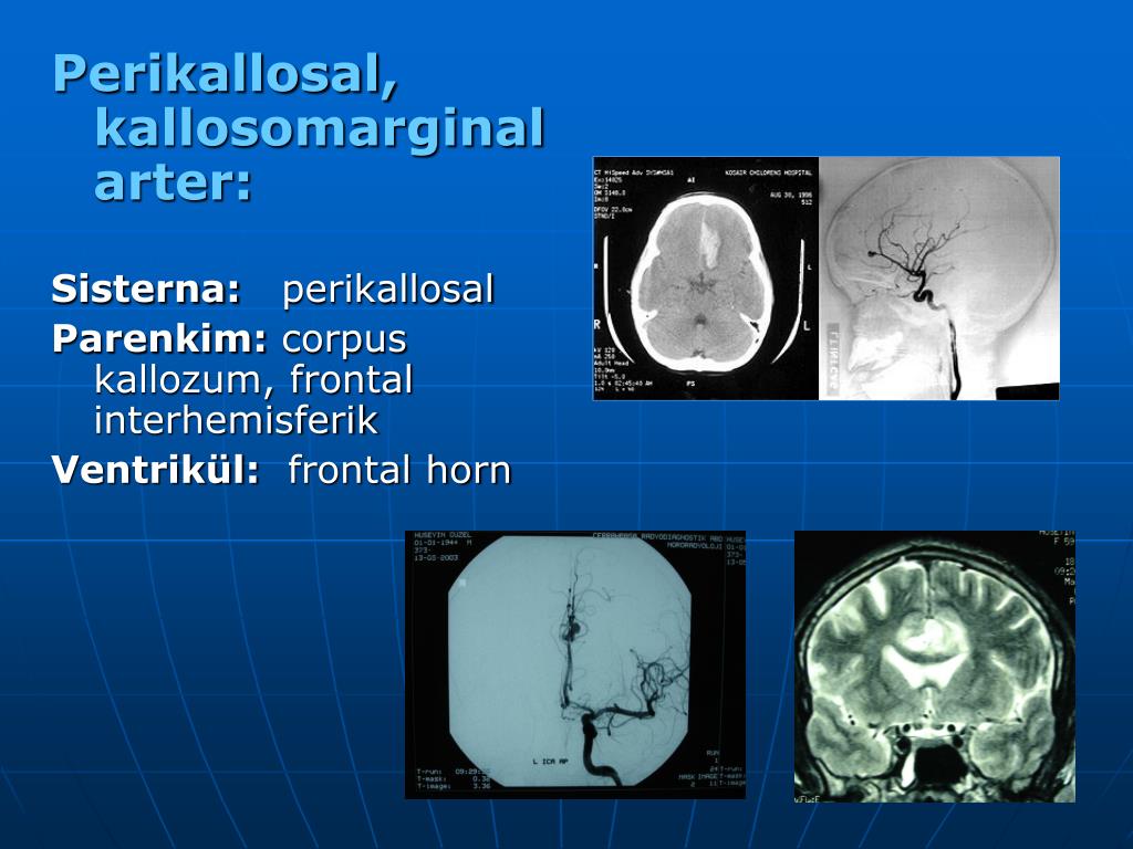 Perikallosal, kallosomarginal arter: Sisterna: perikallosal Parenkim: corpus kallozum, frontal interhemisferik Ventrikül: frontal horn