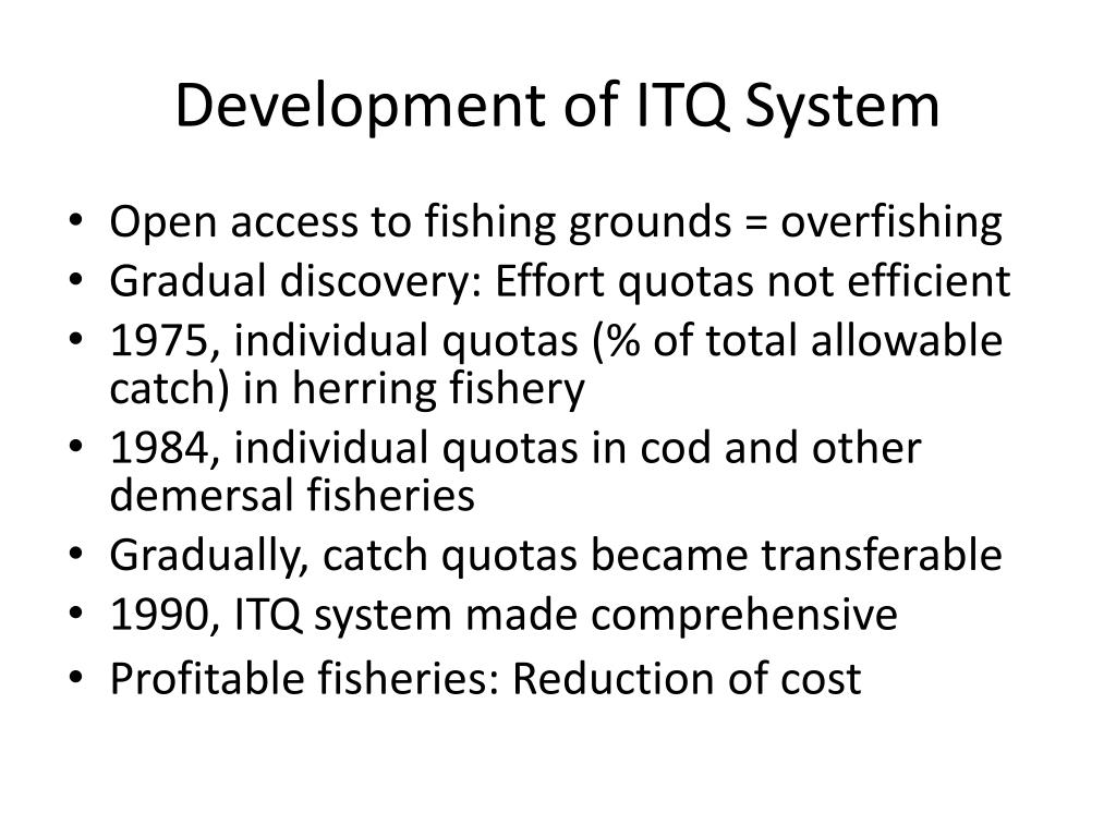 Development of ITQ System • Open access to fishing grounds = overfishing • Gradual discovery: Effort quotas not efficient • 1975, individual quotas (% of total allowable catch) in herring fishery • 1984, individual quotas in cod and other demersal fisheries • Gradually, catch quotas became transferable • 1990, ITQ system made comprehensive • Profitable fisheries: Reduction of cost