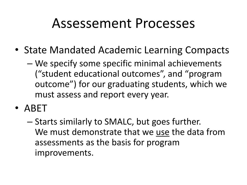 Assessement Processes • State Mandated Academic Learning Compacts • We specify some specific minimal achievements (“student educational outcomes”, and “program outcome”) for our graduating students, which we must assess and report every year. • ABET • Starts similarly to SMALC, but goes further. We must demonstrate that we use the data from assessments as the basis for program improvements.