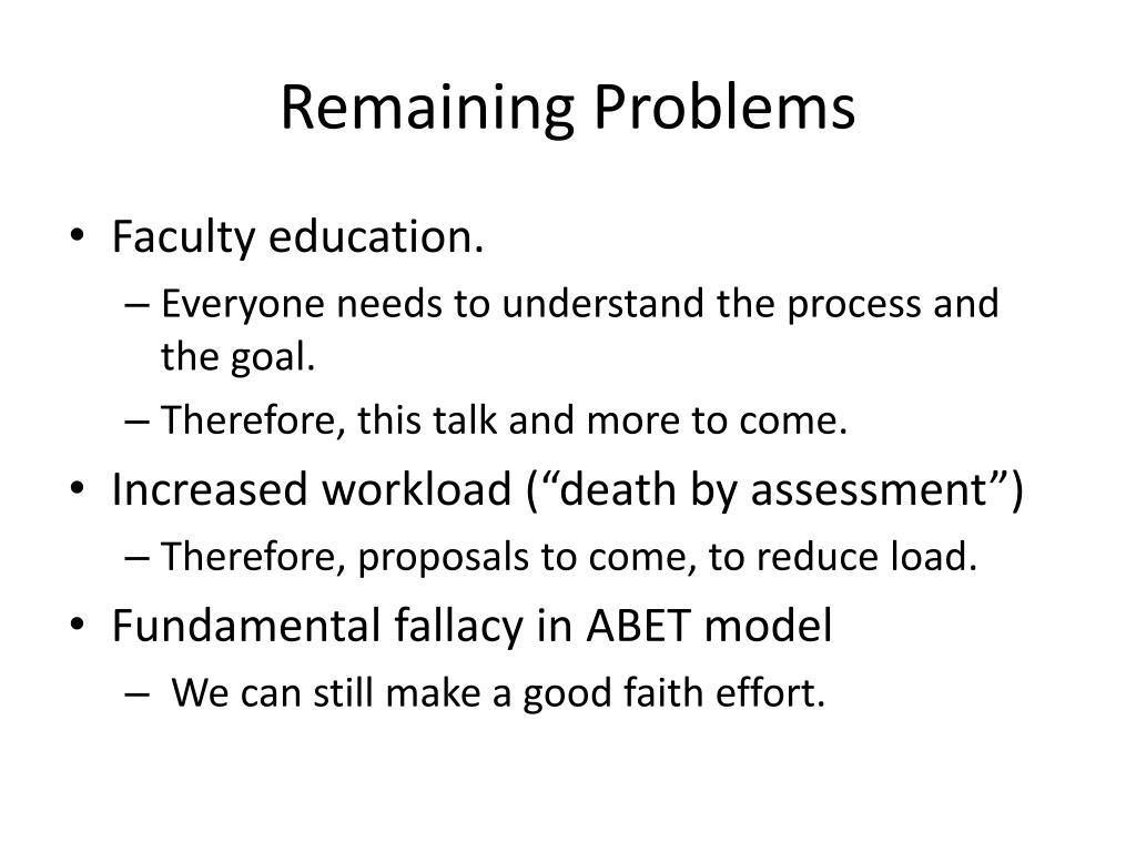 Remaining Problems • Faculty education. • Everyone needs to understand the process and the goal. • Therefore, this talk and more to come. • Increased workload (“death by assessment”) • Therefore, proposals to come, to reduce load. • Fundamental fallacy in ABET model • We can still make a good faith effort.