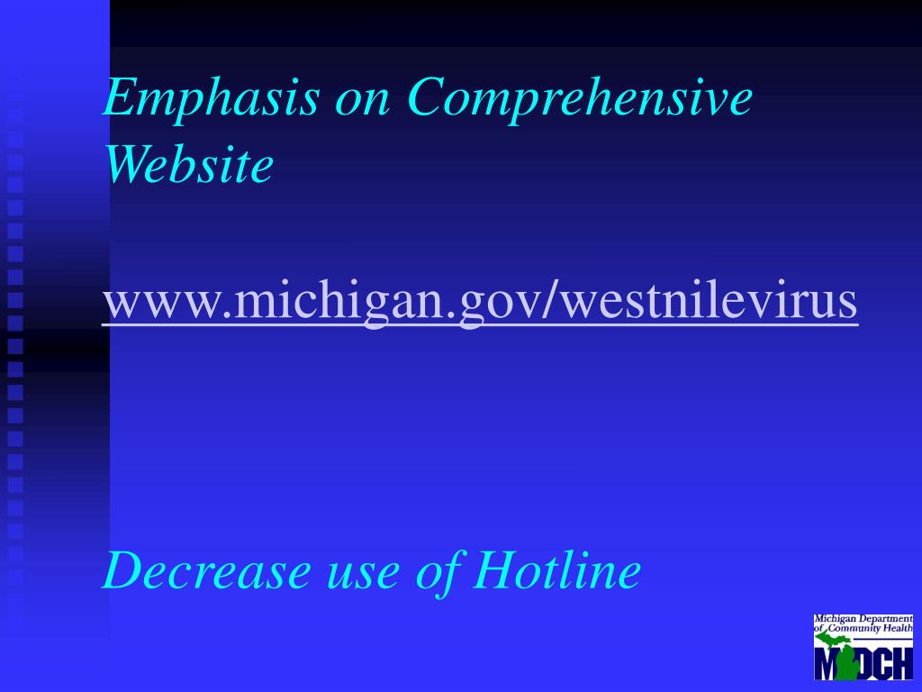 Emphasis on Comprehensive Websitewww.michigan.gov/westnilevirusDecrease use of Hotline
