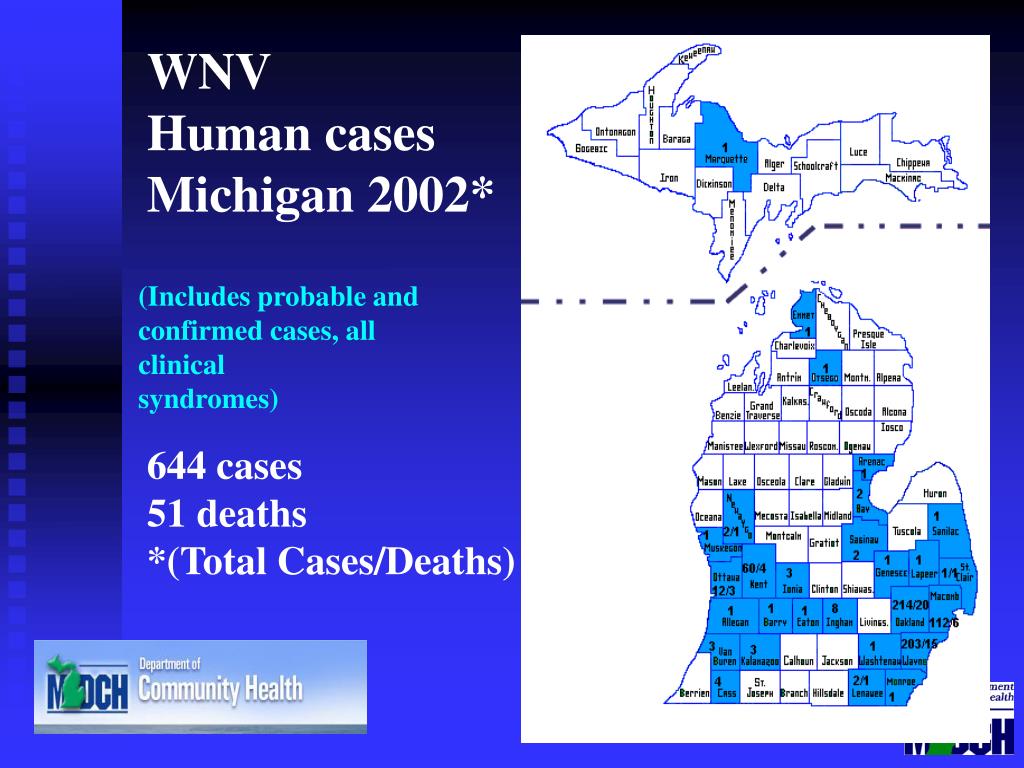 WNV Human cases Michigan 2002* (Includes probable and confirmed cases, all clinical syndromes) 644 cases 51 deaths *(Total Cases/Deaths)