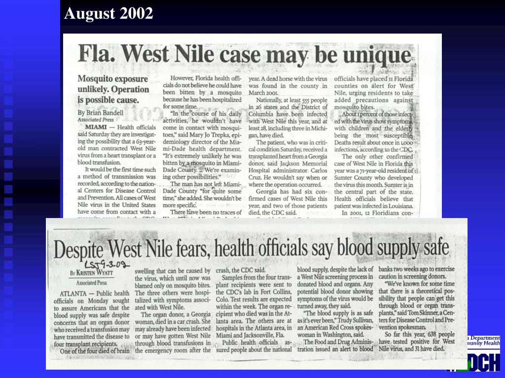 Novel Modes of West Nile Virus Transmission, 2002 • Transplanted organs • Transfused blood • Breast milk • Percutaneous, occupational exposure • Prenatal transmission