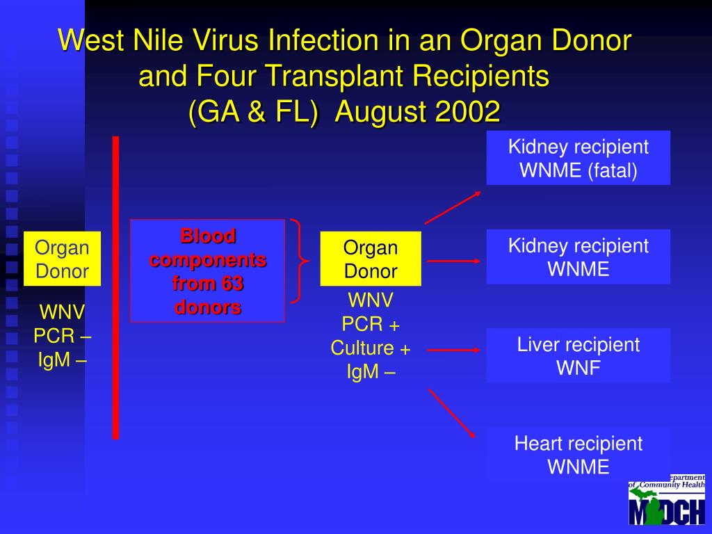Kidney recipientWNME (fatal) Kidney recipientWNME Liver recipientWNF Heart recipientWNME West Nile Virus Infection in an Organ Donor and Four Transplant Recipients(GA & FL) August 2002 Blood components from 63 donors Organ Donor Organ Donor WNV PCR +Culture +IgM – WNV PCR –IgM –