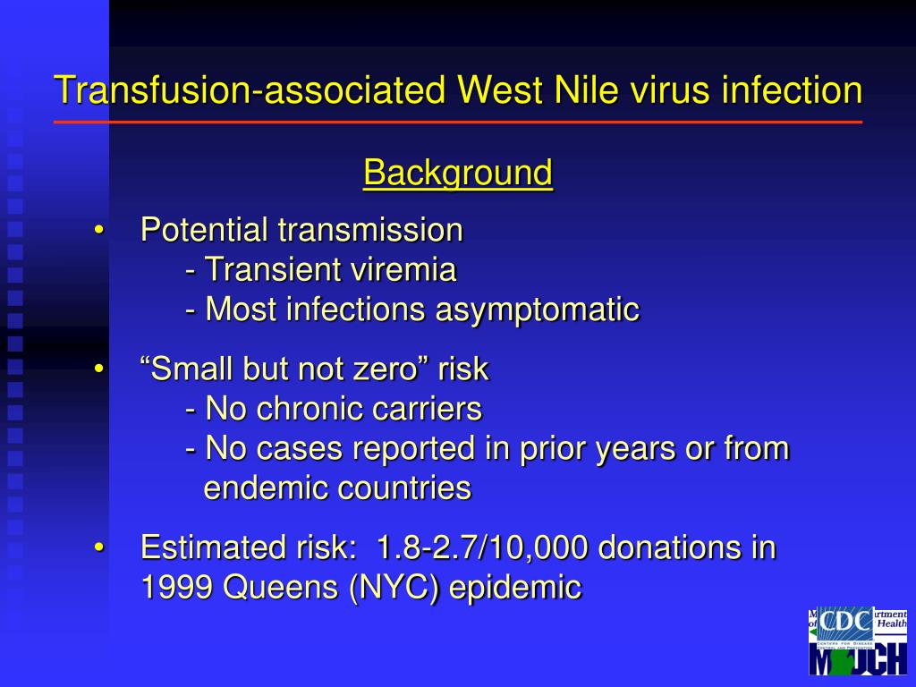 Transfusion-associated West Nile virus infection Background • Potential transmission - Transient viremia - Most infections asymptomatic • “Small but not zero” risk - No chronic carriers - No cases reported in prior years or from endemic countries • Estimated risk: 1.8-2.7/10,000 donations in 1999 Queens (NYC) epidemic