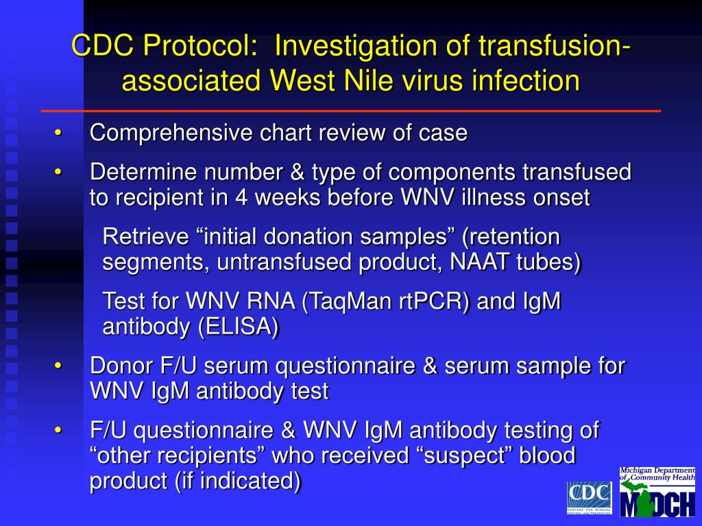 CDC Protocol: Investigation of transfusion-associated West Nile virus infection • Comprehensive chart review of case • Determine number & type of components transfused to recipient in 4 weeks before WNV illness onset • Retrieve “initial donation samples” (retention segments, untransfused product, NAAT tubes) • Test for WNV RNA (TaqMan rtPCR) and IgM antibody (ELISA) • Donor F/U serum questionnaire & serum sample for WNV IgM antibody test • F/U questionnaire & WNV IgM antibody testing of “other recipients” who received “suspect” blood product (if indicated)