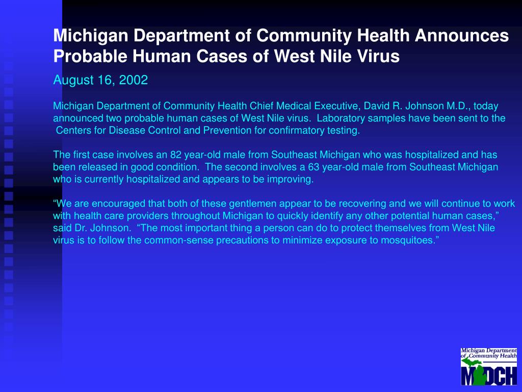Michigan Department of Community Health Announces Probable Human Cases of West Nile Virus August 16, 2002 Michigan Department of Community Health Chief Medical Executive, David R. Johnson M.D., today announced two probable human cases of West Nile virus. Laboratory samples have been sent to the Centers for Disease Control and Prevention for confirmatory testing. The first case involves an 82 year-old male from Southeast Michigan who was hospitalized and has been released in good condition. The second involves a 63 year-old male from Southeast Michigan who is currently hospitalized and appears to be improving. “We are encouraged that both of these gentlemen appear to be recovering and we will continue to work with health care providers throughout Michigan to quickly identify any other potential human cases,” said Dr. Johnson. “The most important thing a person can do to protect themselves from West Nile virus is to follow the common-sense precautions to minimize exposure to mosquitoes.”