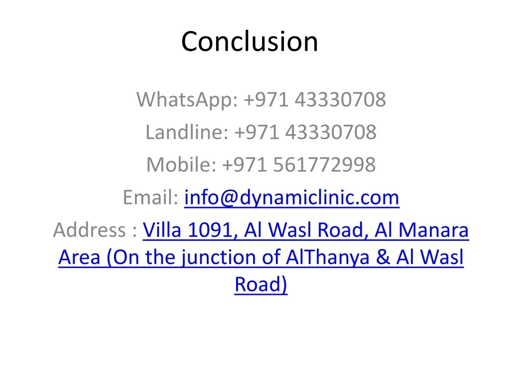 Conclusion WhatsApp: +971 43330708 Landline: +971 43330708 Mobile: +971 561772998 Email: info@dynamiclinic.com Address :Villa 1091, Al Wasl Road, Al Manara Area (On the junction of AlThanya & Al Wasl Road)