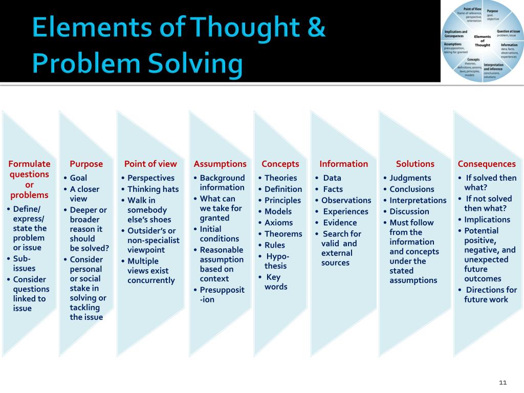 Elements of Thought 1. Purpose of the Thinking 2. Point of View 3. Assumptions 4. Implications and Consequences 5. Data, facts, and Experiences 6. Inferences and Judgments 7. Theories and Concepts 8. Answer a Question or Solve a Problem Source: The Miniature Guide to Critical Thinking: Concepts and Tools, by Drs. R. Paul and L. Elder Apply the Elements of Thought while analyzing readingand writing assignments, lab activities, or projects
