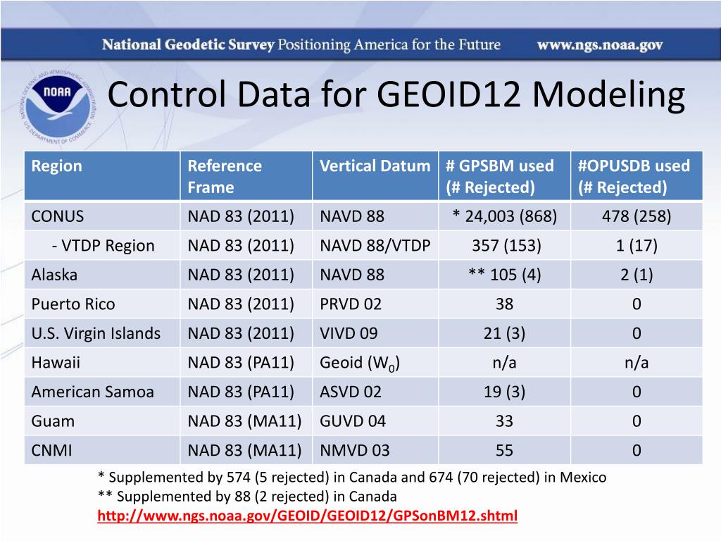 Control Data for GEOID12 Modeling * Supplemented by 574 (5 rejected) in Canada and 674 (70 rejected) in Mexico ** Supplemented by 88 (2 rejected) in Canada http://www.ngs.noaa.gov/GEOID/GEOID12/GPSonBM12.shtml