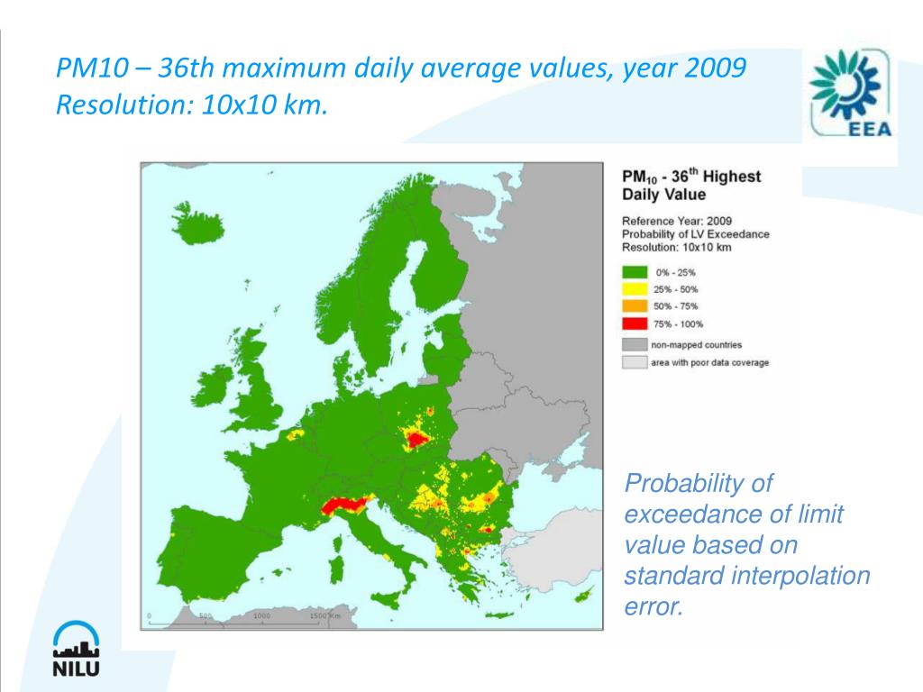 PM10 – 36th maximum daily average values, year 2009 Resolution: 10x10 km. Probability of exceedance of limit value based on standard interpolation error.