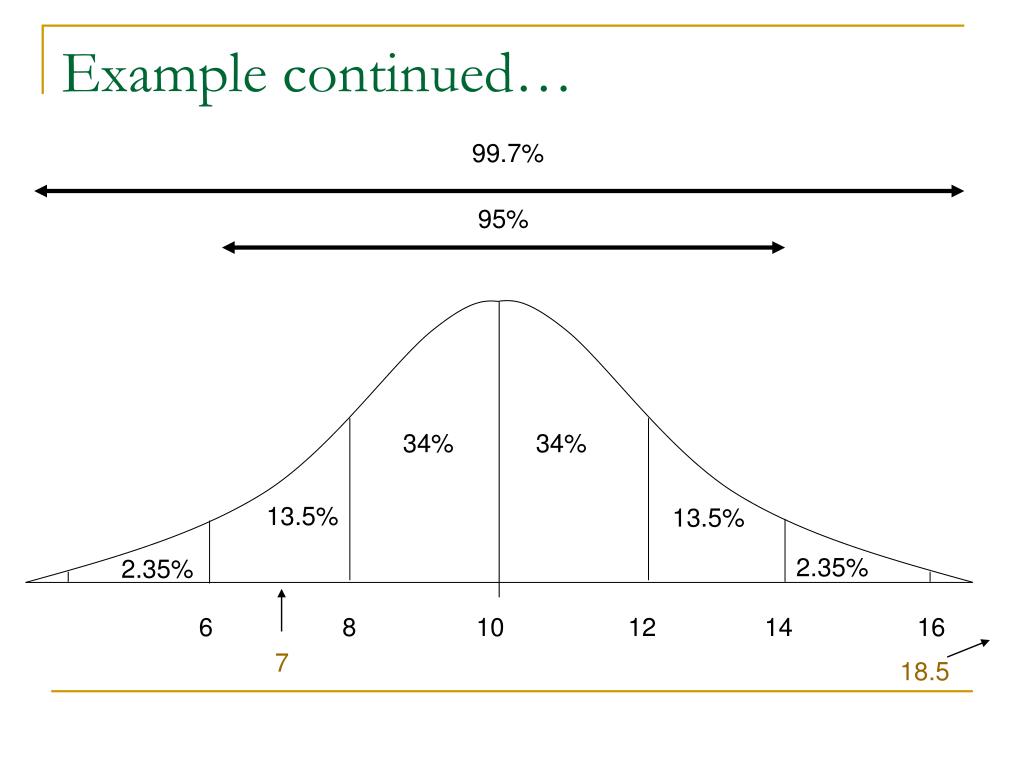 Example continued… 99.7% 95% 34% 34% 13.5% 13.5% 2.35% 2.35% 6 8 10 12 14 16 7 18.5