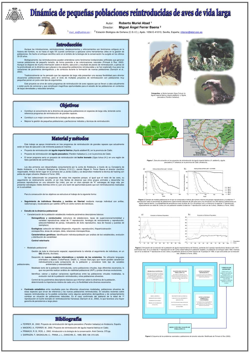 Aunque las introducciones, reintroducciones, desplazamientos y reforzamientos son fenómenos antiguos en la historia del hombre, no es hasta el siglo XX cuando comienzan a aplicarse como herramientas útiles en la gestión de poblaciones. De hecho el enfoque científico serio en el ámbito de la biología de la conservación ha surgido en los últimos 20-25 años. Biológicamente, las reintroducciones pueden entenderse como fenómenos fundacionales artificiales que generan nuevas poblaciones de pequeño tamaño, de forma parecida a las colonizaciones naturales (Primack & Ros, 2002). Aunque se dispone de mucha información sobre el diseño, ejecución y resultado de planes de reintroducción, a penas se ha profundizado en la dinámica que subyace a las pequeñas poblaciones reinstauradas y se han explorado muy poco las variaciones de parámetros demográficos y de conducta durante la formación de nuevas poblaciones (Sarrazin et al., 2002). Tradicionalmente se ha pensado que las especies de larga vida presentan una escasa flexibilidad para afrontar situaciones poblacionales extremas, pero el éxito de múltiples proyectos de reintroducción con poblaciones muy pequeñas ponen en juicio este tipo de argumentos. Este proyecto se sirve de varios programas de reintroducción de aves rapaces que se llevan a cabo actualmente o están punto de comenzar y que constituyen magníficas oportunidades para el estudio de las poblaciones en contextos de bajas densidades y reducidos tamaños. Introducción ESTOCASTICIDAD DEMOGRÁFICA La variación en las tasa de natalidad y mortalidad producen fluctuaciones en el tamaño de las poblaciones ESTOCASTICIDAD AMBIENTAL Y CATÁSTROFES La variación al azar o no predecible de las condiciones del medio biótico y abiótico pude provocar variaciones en el tamaño de las poblaciones Fotografías. a) Buitre leonado (Gyps Fulvus); b) Águila imperial ibérica (Aquila adalberti); c) Águila pescadora (Pandion haliaetus). • Contribuir al conocimiento de la dinámica de pequeñas poblaciones en especies de larga vida, teniendo como referencia programas de reintroducción de grandes rapaces. • Contribuir a un mejor conocimiento de la biología de estas especies. • Mejorar la gestión de pequeñas poblaciones y perfeccionar métodos y técnicas de reintroducción. Objetivos • Este trabajo se apoya inicialmente en tres programas de reintroducción de grandes rapaces que actualmente están en fase de ejecución o de inminente puesta en marcha: • Proyecto de reintroducción del águila imperial ibérica (Aquila adalberti B.) en la provincia de Cádiz. • Proyecto de reintroducción del águila pescadora (Pandion haliaetus (L.)) en la provincia de Cádiz. • El tercer programa sería un proyecto de reintroducción del buitre leonado (Gyps fulvus (H.)) en una región de Italia (pendiente de confirmación). • Los dos primeros son desarrollados conjuntamente por la Junta de Andalucía, a través de su Consejería de Medio Ambiente, y la Estación Biológica de Doñana (C.S.I.C.), siendo Miguel A. Ferrer Baena el director científico responsable. Ambos tienen lugar en la comarca de La Janda (Cádiz) y se desarrollan mediante la técnica de hacking con pollos de origen silvestre (Madero & Ferrer, 200). • Se han seleccionado los programas de estas tres especies porque, al igual que el resto de las aves, su seguimiento es relativamente sencillo, al ser más fáciles de observar que otros grupos animales y desarrollar los procesos reproductivos en una ubicación fija (nido), por ser un claro ejemplo de “K” estrategas de larga vida, por presentar estrategias vitales distintas entre si y por una razón de oportunidad puesto que son reintroducciones realizadas en la actualidad. • Para la consecución de los objetivos se estructura el trabajo de la siguiente forma: • Seguimiento de individuos liberados y nacidos en libertad mediante marcaje individual con anillas, radiomarcaje y localizadores por satélite (GPS) en cierto número de individuos. • Estudio de ladinámica poblacional • • Caracterización de la población establecida mediante parámetros descriptores básicos: • Demográficos y conductuales: estructura de edades/sexo, tasas de supervivencia/mortalidad y variables reproductivas (edad de 1ª reproducción, fenología de reclutamiento y reproducción, selección/fidelidad de pareja, indicadores de éxito reproductivo, tasa de fracaso y puestas de reemplazo). • Ecológicos: selección de hábitat (dispersión, migración, reproducción), filopatría/atracción conespecífica, áreas de campeo, dieta, relaciones interespecíficas. • Características genéticas: identificación individuo/población por análisis de loci establecidos, evolución y distribución de variabilidad. • Control veterinario • Modelado poblacional: • Gestión de toda la información espacial, especialmente la referida al seguimiento de individuos, en un SIG (ArcInfo, ArcView). • Desarrollo de nuevos modelos informáticos y revisión de los existentes. Se utilizarán lenguajes orientados a objetos (TurboPascal, Delphi, C, incluso StarLogo) que hacen posible caracterizar individualmente a cada componente de la población y considerar todo tipo de variables poblacionales, ambientales y estocasticidad. • Modelado tanto de la población reintroducida, como poblaciones virtuales, bajo diferentes escenarios, lo que nos permite realizar análisis de viabilidad poblacional (AVP) y probar diversas evoluciones. • Identificar, valorar y explicar variaciones significativas entre las poblaciones virtuales modeladas, la evolución real de la población reintroducida y otras poblaciones silvestres. • Control de los parámetros descriptores básicos que informan sobre la dinámica de la población, determinando la importancia relativa de cada uno y la flexibilidad ante diversos escenarios. • Contraste estadístico entre resultados para las diferentes situaciones modeladas