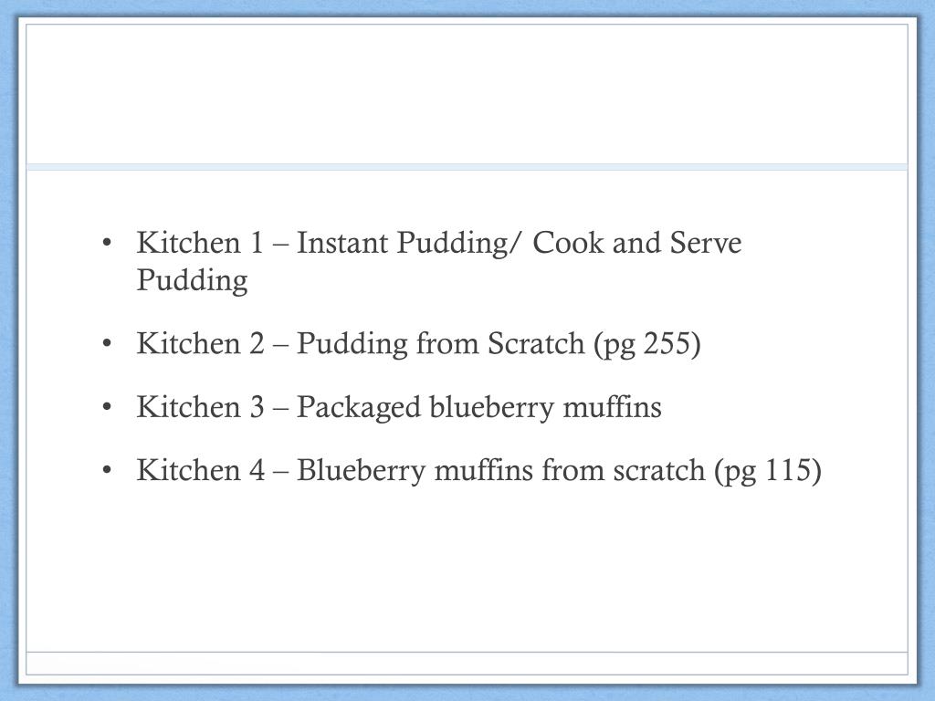 Kitchen 1 – Instant Pudding/ Cook and Serve Pudding • Kitchen 2 – Pudding from Scratch (pg 255) • Kitchen 3 – Packaged blueberry muffins • Kitchen 4– Blueberry muffins from scratch (pg 115)