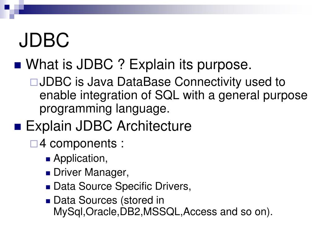 JDBC • What is JDBC ? Explain its purpose. • JDBC is Java DataBase Connectivity used to enable integration of SQL with a general purpose programming language. • Explain JDBC Architecture • 4 components : • Application, • Driver Manager, • Data Source Specific Drivers, • Data Sources (stored in MySql,Oracle,DB2,MSSQL,Access and so on).