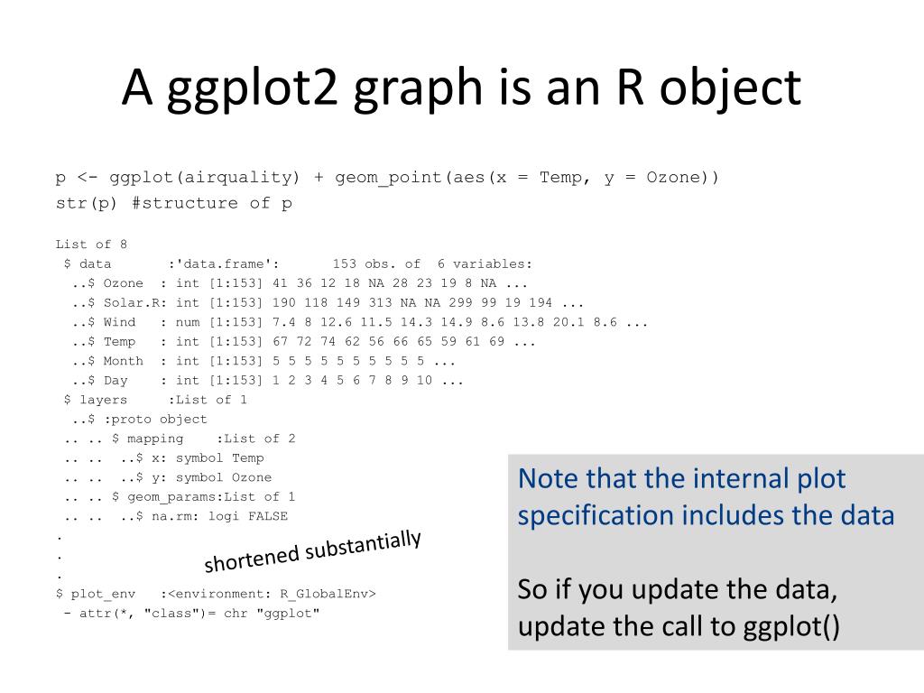 A ggplot2 graph is an R object p <- ggplot(airquality) + geom_point(aes(x = Temp, y = Ozone)) str(p) #structure of p List of 8 $ data :'data.frame': 153 obs. of 6 variables: ..$ Ozone : int [1:153] 41 36 12 18 NA 28 23 19 8 NA ... ..$ Solar.R: int [1:153] 190 118 149 313 NA NA 299 99 19 194 ... ..$ Wind : num [1:153] 7.4 8 12.6 11.5 14.3 14.9 8.6 13.8 20.1 8.6 ... ..$ Temp : int [1:153] 67 72 74 62 56 66 65 59 61 69 ... ..$ Month : int [1:153] 5 5 5 5 5 5 5 5 5 5 ... ..$ Day : int [1:153] 1 2 3 4 5 6 7 8 9 10 ... $ layers :List of 1 ..$ :proto object .. .. $ mapping :List of 2 .. .. ..$ x: symbol Temp .. .. ..$ y: symbol Ozone .. .. $ geom_params:List of 1 .. .. ..$ na.rm: logi FALSE . . . $ plot_env :<environment: R_GlobalEnv> - attr(*, "class")= chr "ggplot" Note that the internal plot specification includes the data So if you update the data, update the call to ggplot() shortened substantially