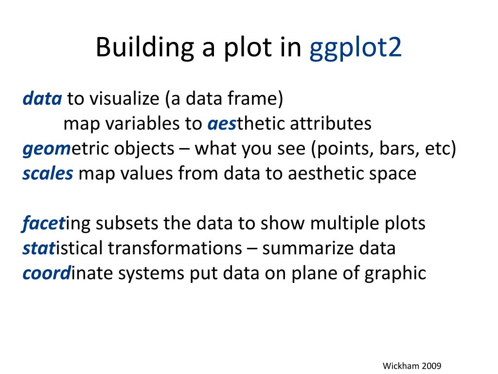 Building a plot in ggplot2 data to visualize (a data frame) map variables to aesthetic attributes geometric objects – what you see (points, bars, etc) scales map values from data to aesthetic space faceting subsets the data to show multiple plots statistical transformations – summarize data coordinate systems put data on plane of graphic Wickham 2009