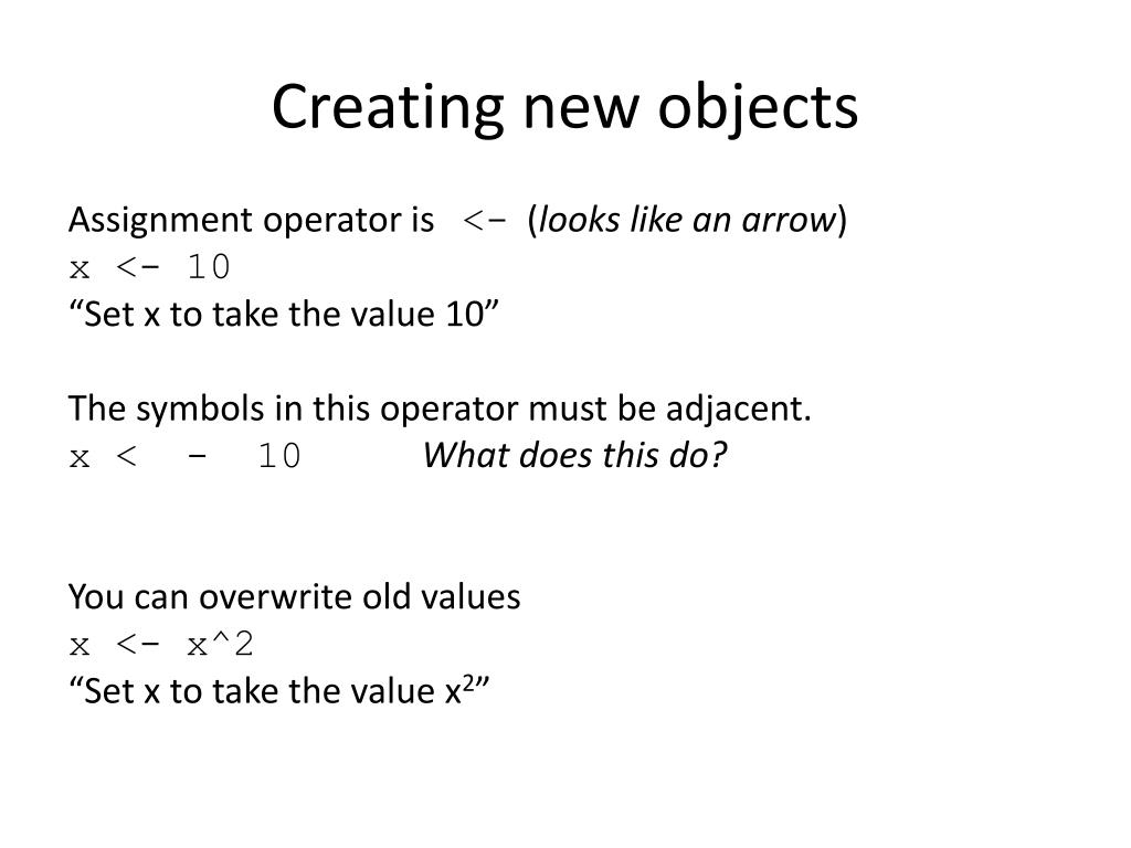 Creating new objects Assignment operator is <- (looks like an arrow) x <- 10 “Set x to take the value 10” The symbols in this operator must be adjacent. x < - 10 What does this do? You can overwrite old values x <- x^2 “Set x to take the value x2”