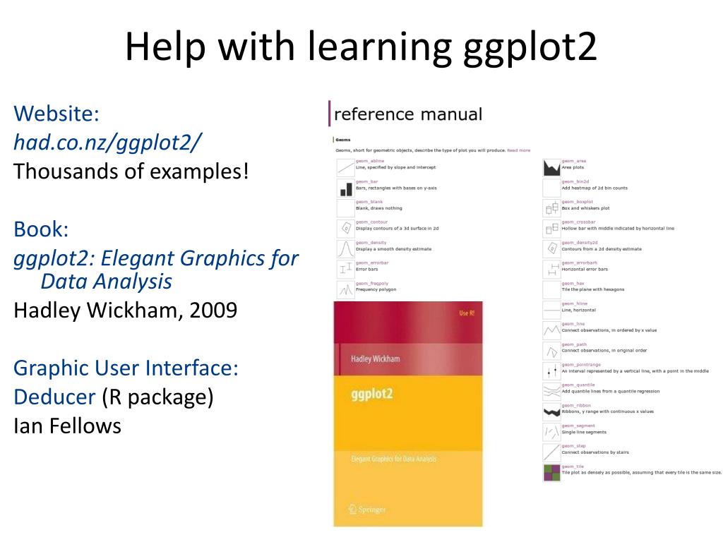 Help with learning ggplot2 Website: had.co.nz/ggplot2/ Thousands of examples! Book: ggplot2: Elegant Graphics for Data Analysis Hadley Wickham, 2009 Graphic User Interface: Deducer(R package) Ian Fellows