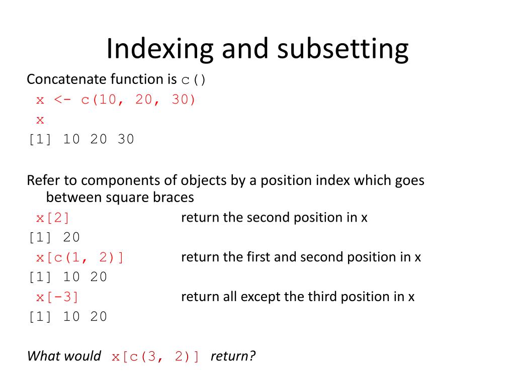 Indexing and subsetting Concatenate function is c() x <- c(10, 20, 30) x [1] 10 20 30 Refer to components of objects by a position index which goes between square braces x[2] return the second position in x [1] 20 x[c(1, 2)] return the first and second position in x [1] 10 20 x[-3] return all except the third position in x [1] 10 20 What wouldx[c(3, 2)]return?