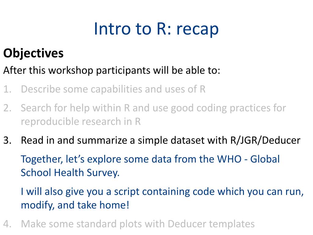 Intro to R: recap Objectives After this workshop participants will be able to: • Describe some capabilities and uses of R • Search for help within R and use good coding practices for reproducible research in R • Read in and summarize a simple dataset with R/JGR/Deducer Together, let’s explore some data from the WHO - Global School Health Survey. I will also give you ascript containing code which you can run, modify, and take home! • Make some standard plots with Deducer templates