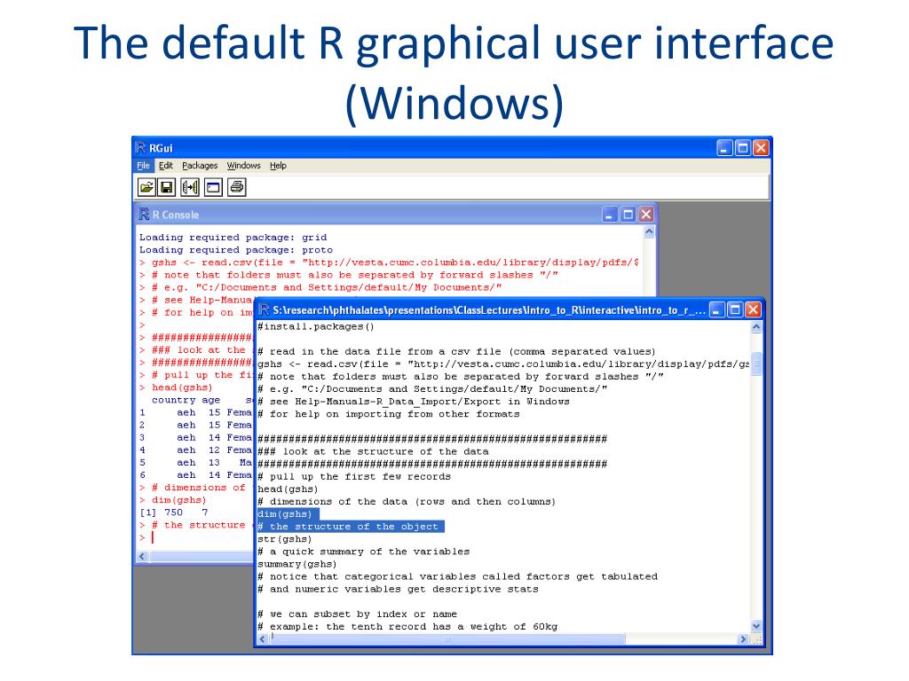 Recap on GUIs R Default Windows GUI: lacks additional features to make learning or programming easier JGR: Makes programming easier with syntax highlighting and command argument suggestions. No menus for stats. Looks the same across platforms (Java based) Deducer: Adds menus for basic stats to JGR. Menu driven graphics options (building with ggplot2).