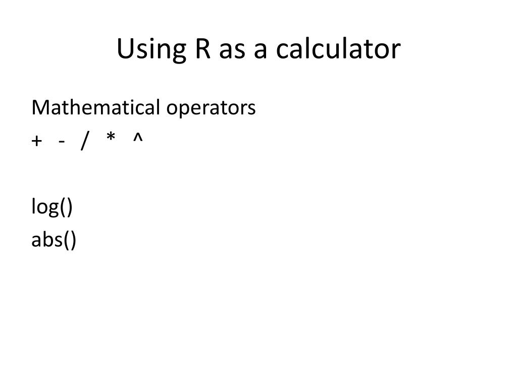 Using R as a calculator Mathematical operators + - / * ^ log() abs()