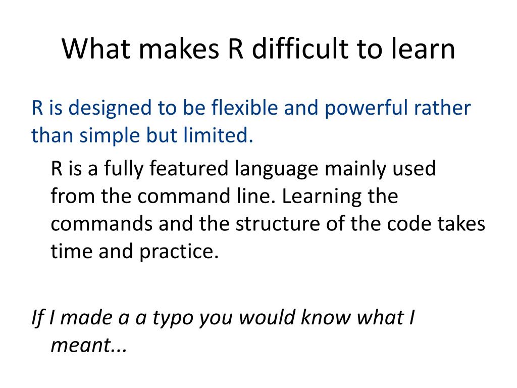 What makes R difficult to learn R is designed to be flexible and powerful rather than simple but limited. R is a fully featured language mainly used from the command line. Learning the commands and the structure of the code takes time and practice. If I made a a typo you would know what I meant...