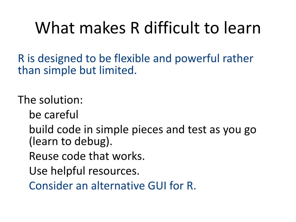 What makes R difficult to learn R is designed to be flexible and powerful rather than simple but limited. The solution: be careful build code in simple pieces and test as you go (learn to debug). Reuse code that works. Use helpful resources. Consider an alternative GUI for R.