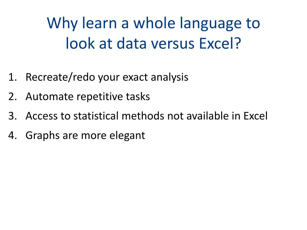 Why learn a whole language to look at data versus Excel? • Recreate/redo your exact analysis • Automate repetitive tasks • Access to statistical methods not available in Excel • Graphs are more elegant