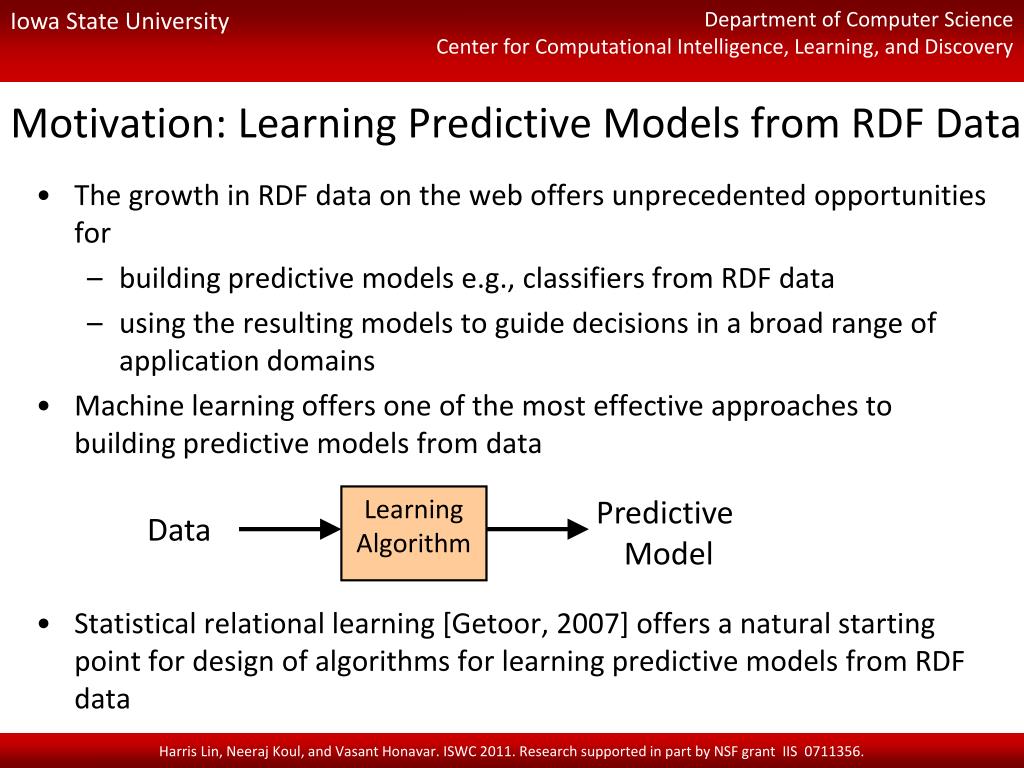 Learning Relational Bayesian Classifiersfrom RDF Data Harris Lin, Neeraj Koul, and Vasant Honavar Artificial Intelligence Research Laboratory Department of Computer Science Iowa State University htlin@iastate.edu