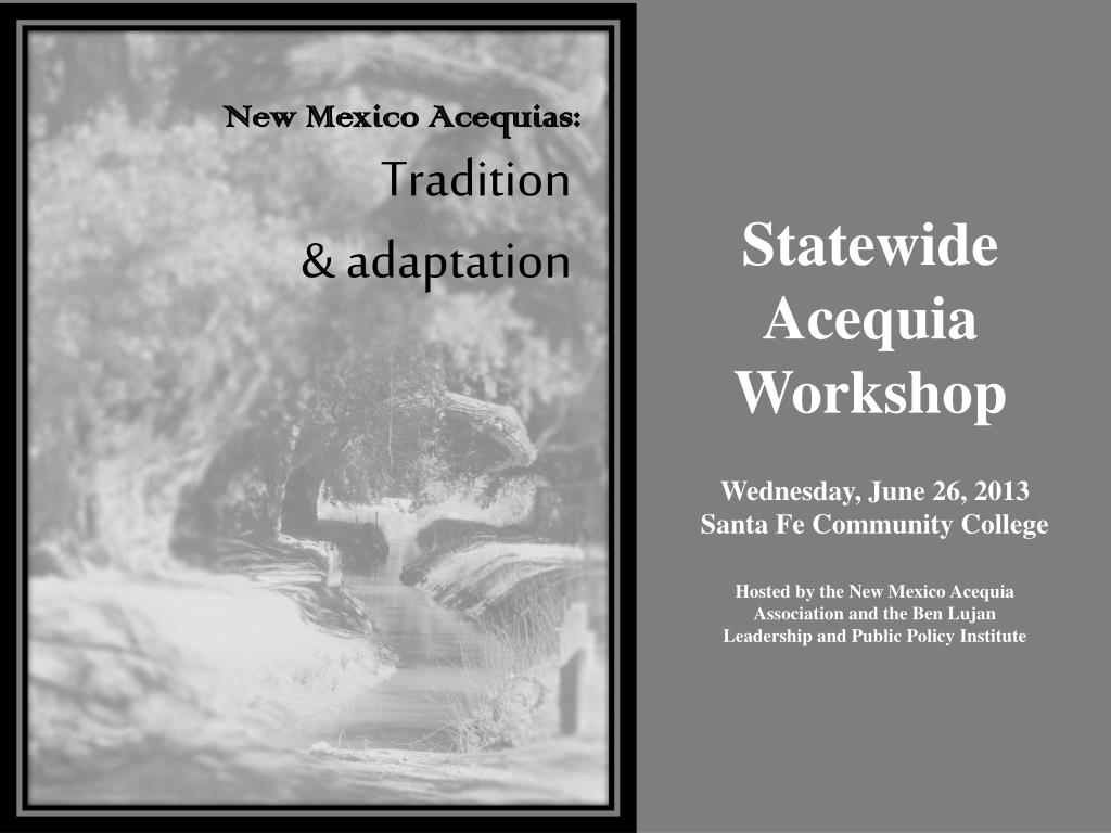 New Mexico Acequias:. Tradition & adaptation. Statewide Acequia Workshop. Wednesday, June 26, 2013 Santa Fe Community College. Hosted by the New Mexico Acequia Association and the Ben Lujan Leadership and Public Policy Institute.