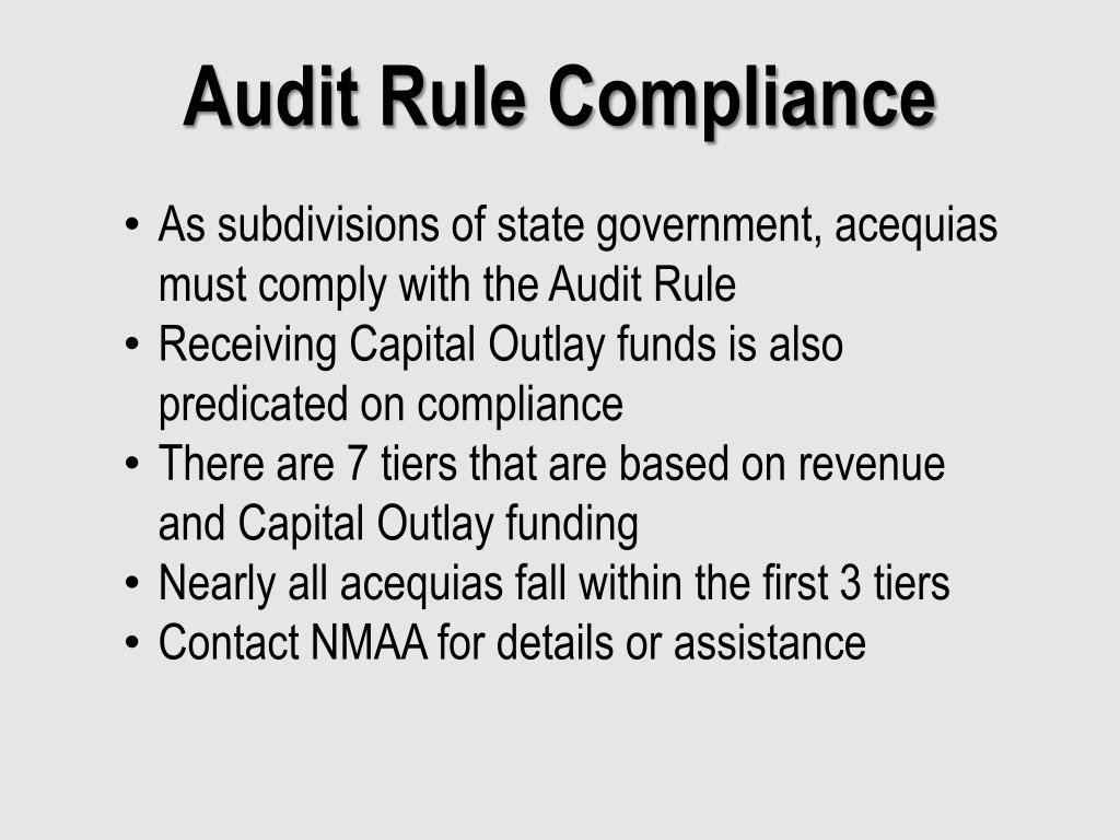 Audit Rule Compliance • As subdivisions of state government, acequias must comply with the Audit Rule • Receiving Capital Outlay funds is also predicated on compliance • There are 7 tiers that are based on revenue and Capital Outlay funding • Nearly all acequias fall within the first 3 tiers • Contact NMAA for details or assistance