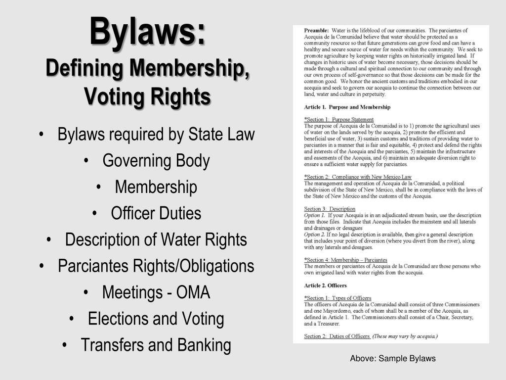 Bylaws: Defining Membership, Voting Rights • Bylaws required by State Law • Governing Body • Membership • Officer Duties • Description of Water Rights • Parciantes Rights/Obligations • Meetings - OMA • Elections and Voting • Transfers and Banking Above: Sample Bylaws