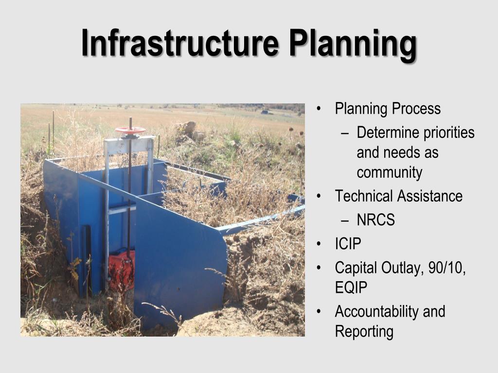 Infrastructure Planning • Planning Process • Determine priorities and needs as community • Technical Assistance • NRCS • ICIP • Capital Outlay, 90/10, EQIP • Accountability and Reporting