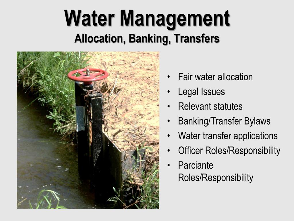 Water Management Allocation, Banking, Transfers • Fair water allocation • Legal Issues • Relevant statutes • Banking/Transfer Bylaws • Water transfer applications • Officer Roles/Responsibility • Parciante Roles/Responsibility