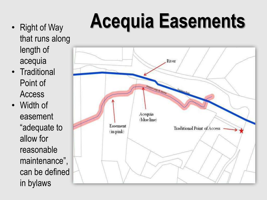 Acequia Easements • Right of Way that runs along length of acequia • Traditional Point of Access • Width of easement “adequate to allow for reasonable maintenance”, can be defined in bylaws
