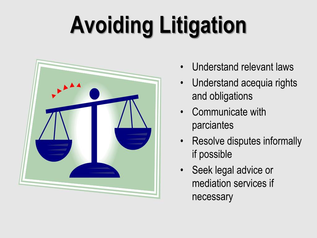 Avoiding Litigation • Understand relevant laws • Understand acequia rights and obligations • Communicate with parciantes • Resolve disputes informally if possible • Seek legal advice or mediation services if necessary