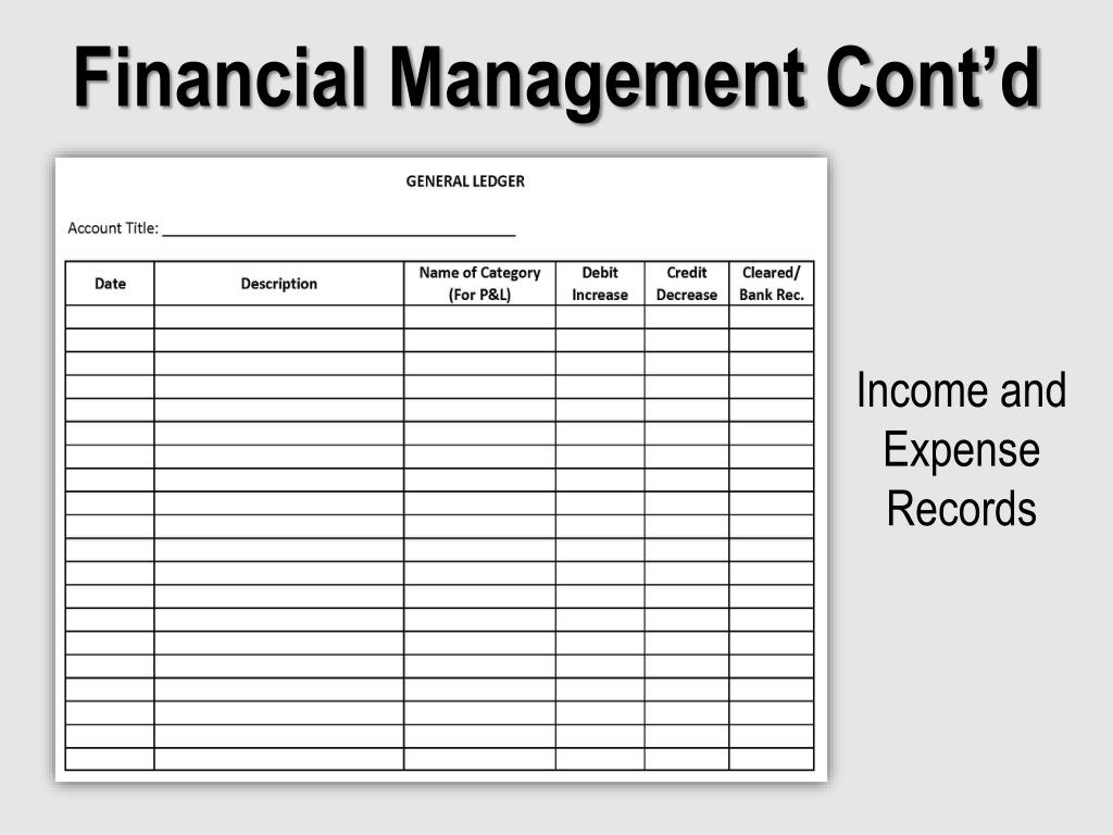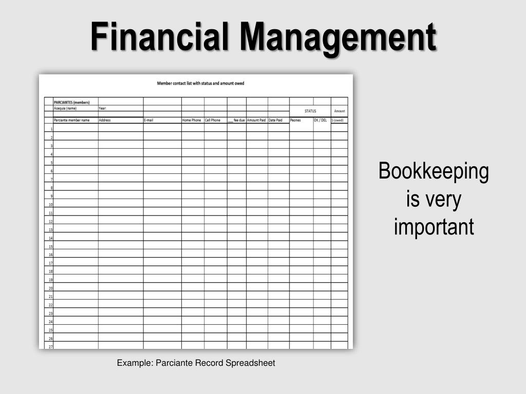 Financial Management Bookkeeping is very important Example: Parciante Record Spreadsheet