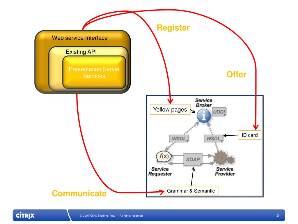 Register Web service Interface Existing API Presentation Server Services Offer Yellow pages ID card Communicate Grammar & Semantic