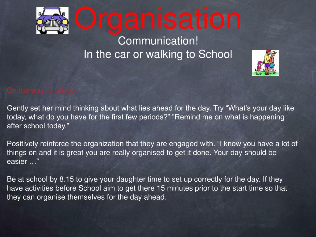 Organisation On the way home from school: If you can, gently de construct the day and acknowledge those really positive experiences where organisation played a significant part. If things have gone badly during the day due to organisational issues, then choose your time re visit the experience and deconstruct it to highlight where a lack of organisation might have played a part. “Things didn’t go well by your own admission because of… Why do you think this was so... Which of the things discussed you had control (often organisational ones) over and could make a change to… • Communication! • In the car or walking to School